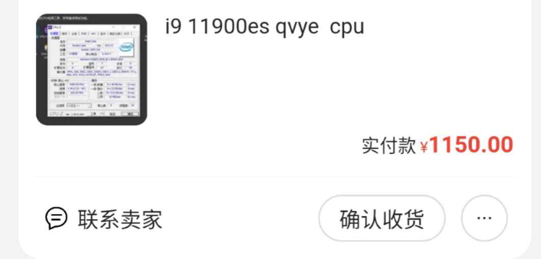 先介绍CPU:QVYE(i9-11900es),8C16T,全核睿频4.1,单核睿频4.4,锁倍频,内存频率最高3200,十一代酷睿新架构,14nm祖传工艺,1150元购于大黄鱼二手。