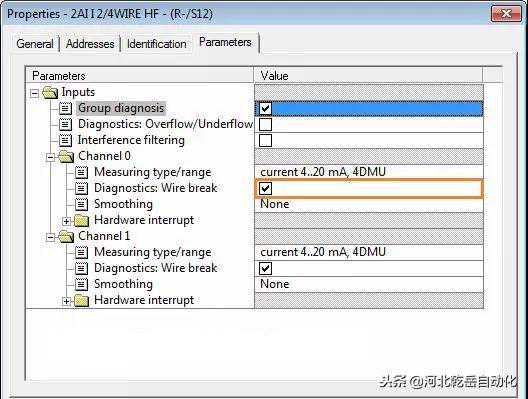 要使用诊断功能,首先模块本身要支持诊断功能,其次需要在硬件组态上把诊断功能开启。比如使用ET200S的2AI2/4WIREHF模拟量模块,该模块支持断线诊断功能。通过勾选“Diagnostics:WireBreak(诊断:断线)”选项,可以开启通道0和通道1的断线诊断功能,如下图: