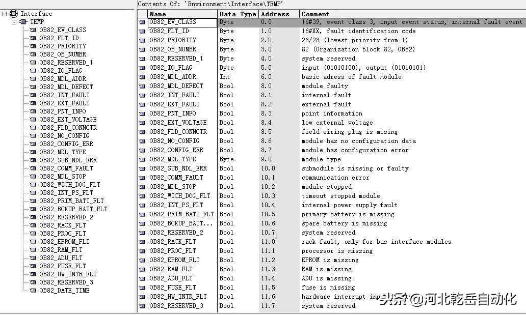 OB82是PLC的操作系统和用户程序沟通的桥梁,它有很多的临时变量,如下图:
