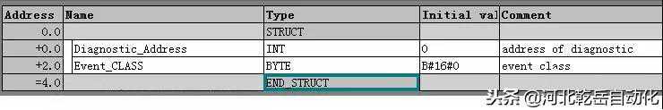 首先,新建一个全局数据块,命名为DB82。在DB82中新建两个变量“Diagnostic_Address”和“Event_Class”,如下图: