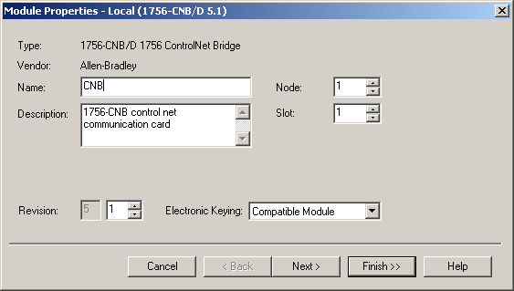 5,CNB通讯模块位于地1号槽(确认一下),并且在ControlNet上的节点是1(观察自己的网络节点)因此按下图所示内容填写。