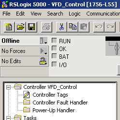 现在我们已经创建了一个ControlLogix项目。此时我们还没有与项目相关的任何I/O模块,项目中也没有可执行的代码(如梯形图)。你正在离线工作。所作的任何改变都只限于软件中,并存储在计算机的硬驱中。在进入到在线操作以前,这些变化并不能反映到5555控制器中。