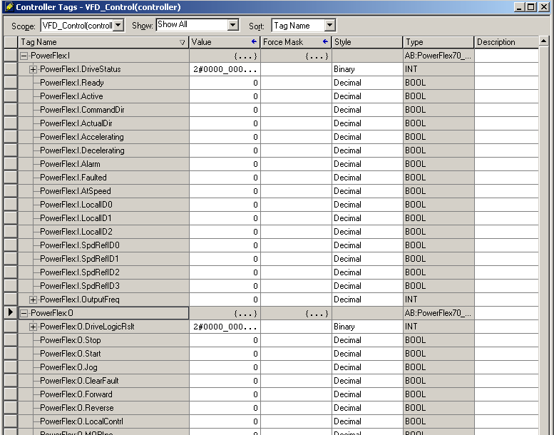 11,现在我们双击控制器标签,观察由RsLogix5000编程软件自动生成的PowerFlex70对象数据模型。