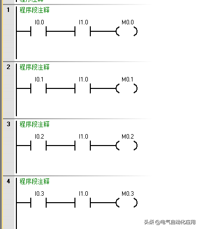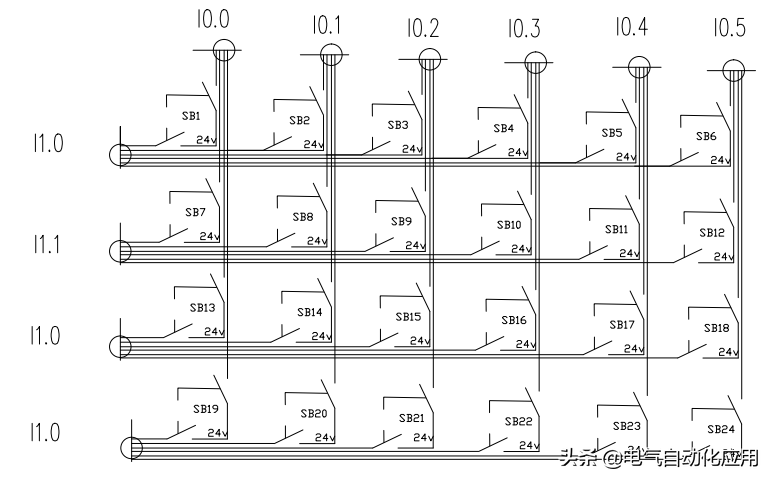 如图:SB1-SB24为24个输入,通过矩阵的形式,PLC只需要使用10个点,节约了14个点,矩阵点数越多节约的点数越多。当SB1按钮按下时,和同时为TRUE,依此类推;