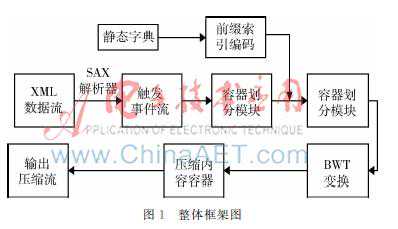 本算法针对实时传输的XML数据流,结合XML数据格式的特点,考虑将数据流中的相关节点利用SAX解析器解析形成触发事件流,并触发对应的处理程序,处理程序结合静态存储的字典,利用前缀索引编码将数据分别存放到对应结构的结构容器和对应内容的内容容器中,达到结构与内容分离的目的。然后,将分离的每个容器中的内容进行BWT变换的预处理,变换的目的是将容器内相关语义的编码尽量靠拢,减小信息熵,这样可以有效地提高对内容进行字典压缩的压缩率。
