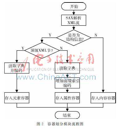 stream标签标志一段数据流的开始。message、present、iq元素称为XML节,每个节点下对应to、from、body等属性标签,设置了一个消息片段的发送方、接收方以及消息实体等信息[6]。协议传输的XML数据流的元素/属性节点类型是固定的,因此可以在通信双方内存中构建静态字典,字典的键为自定义的索引标号,值为协议对应的XML元素/属性节点内容。在数据部分,数据以原始形态被分配到字符容器中。利用相应的压缩算法对每个容器进行处理。容器划分模型的流程图如图2所示。