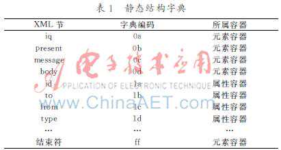 根据上一节所述,设定一个静态的结构字典,如表1所示,结构字典中包含有标准XMPP协议中定义的全部XML节。