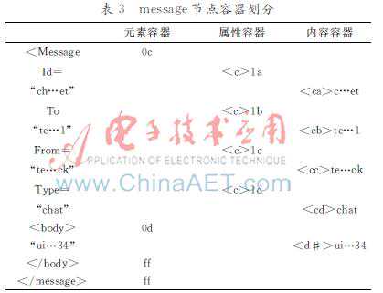 包含前缀索引的字典编码按容器划分方法依次填入相关容器,以message节点为例,最终容器划分结果以及各容器中的数据如表3所示。