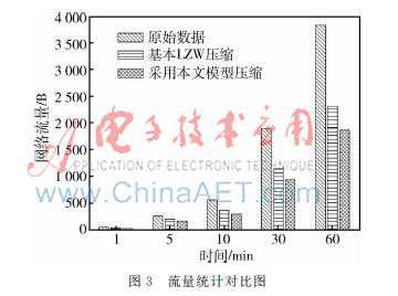 模拟用户对智能设备进行控制并接收设备上报的监测信息,设备每10s上报一次实时数据,用户每分钟对设备发送一条控制指令。通过“科来”网络流量监测软件对一个时段内流经协议端口5222的数据流量在不经过压缩处理、经过基本LZW编码压缩处理和经过本文压缩模型处理后的统计如图3所示。