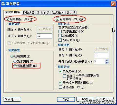 在栅格或栅格捕捉按钮上右键,点“设置”,在草图设置对话框的“捕捉类型”中点选“等轴侧捕捉”即可,如下图所示。
