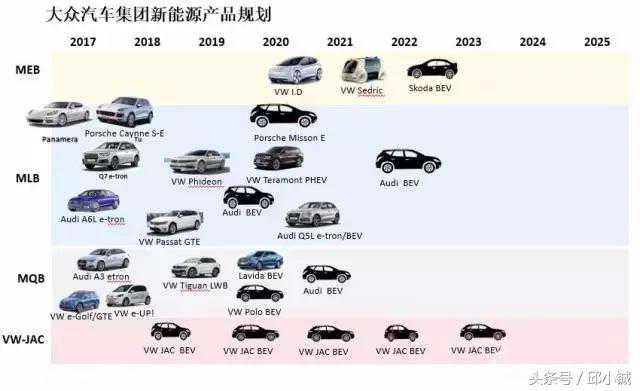 我们可以看到,大众目前旗下的纯电动车是非常少的,笔者能够想到的也只有e-Golf和之前没有量产的R8e-tron纯电动版。大众目前的新能源车还是以PHEV插电式混合动力车为主,像GolfGTE、蔚揽GTW、A3e-tron、A6Le-tron等,这些车几乎都是使用的MQB平台,包括纯电动版的e-Golf在内,大众现在能够拿的出手的平台也只有MQB了,外加一个纵置的MLB平台。这些传统的燃油动力车型平台,显然是无法满足大众大面积量产电动车的需求的。即便有一个全新的MEB平台,但就目前来讲,无法满足生产低价新能源车的需求。