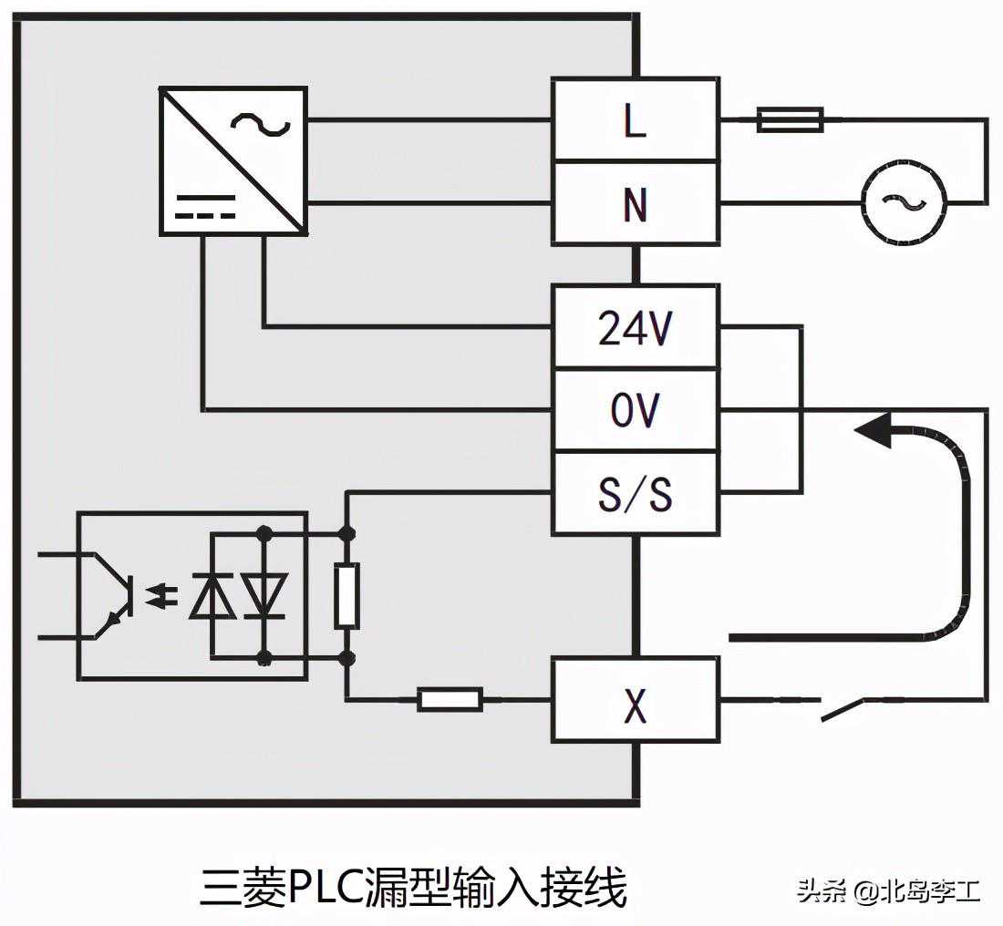 在三菱PLC中,如果公共端[S/S]连接24V电源正极,电流从通道流出并回到24V电源负极,称为漏型接线方式,如下图所示: