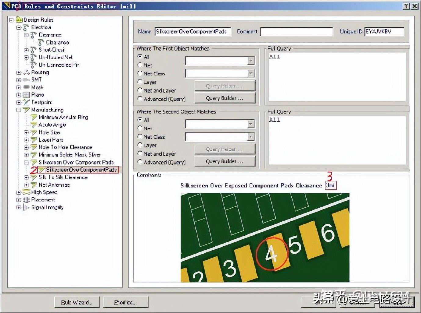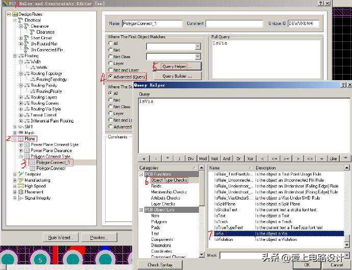 规则设置(RulesandConstraintsEditor)中,选择多边形铺铜连接类型(polygonconnectstyle),如下图示意:点选QueryHelper钮进入QueryHelper对话框,在左边选择Objecttypechecks,在右边选择ISVIA,OK即可,再将此规则优先级设置高于所ALL对象的优先级。
