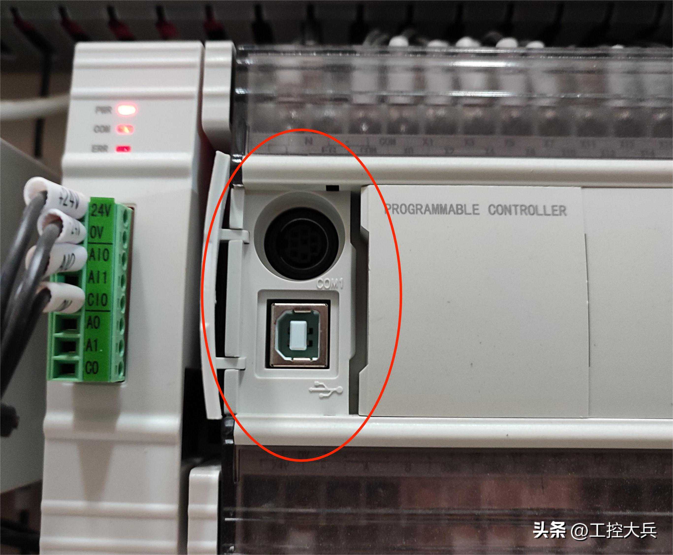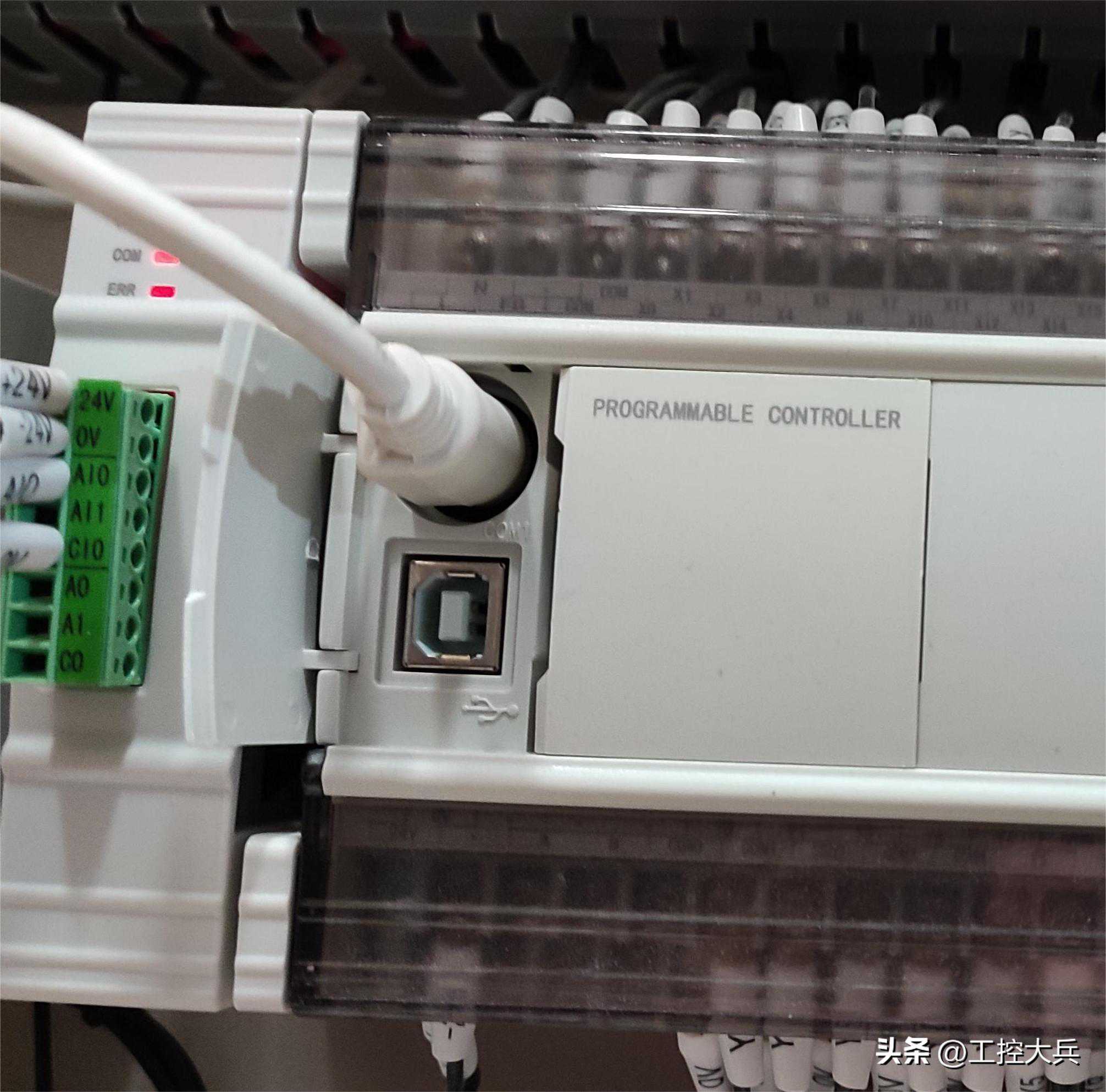 下载前先带大家了解一下PLC的下载接口,如下图PLC的正面左边有两个下载口,一个是RS232(圆的)8针口,另一个是USB口(方的),RS232除了下载主要还用于与触摸屏通信使用,今天呢我们主要以USB口为例来为大家介绍下载过程。软件默认是使用RS232口进行下载