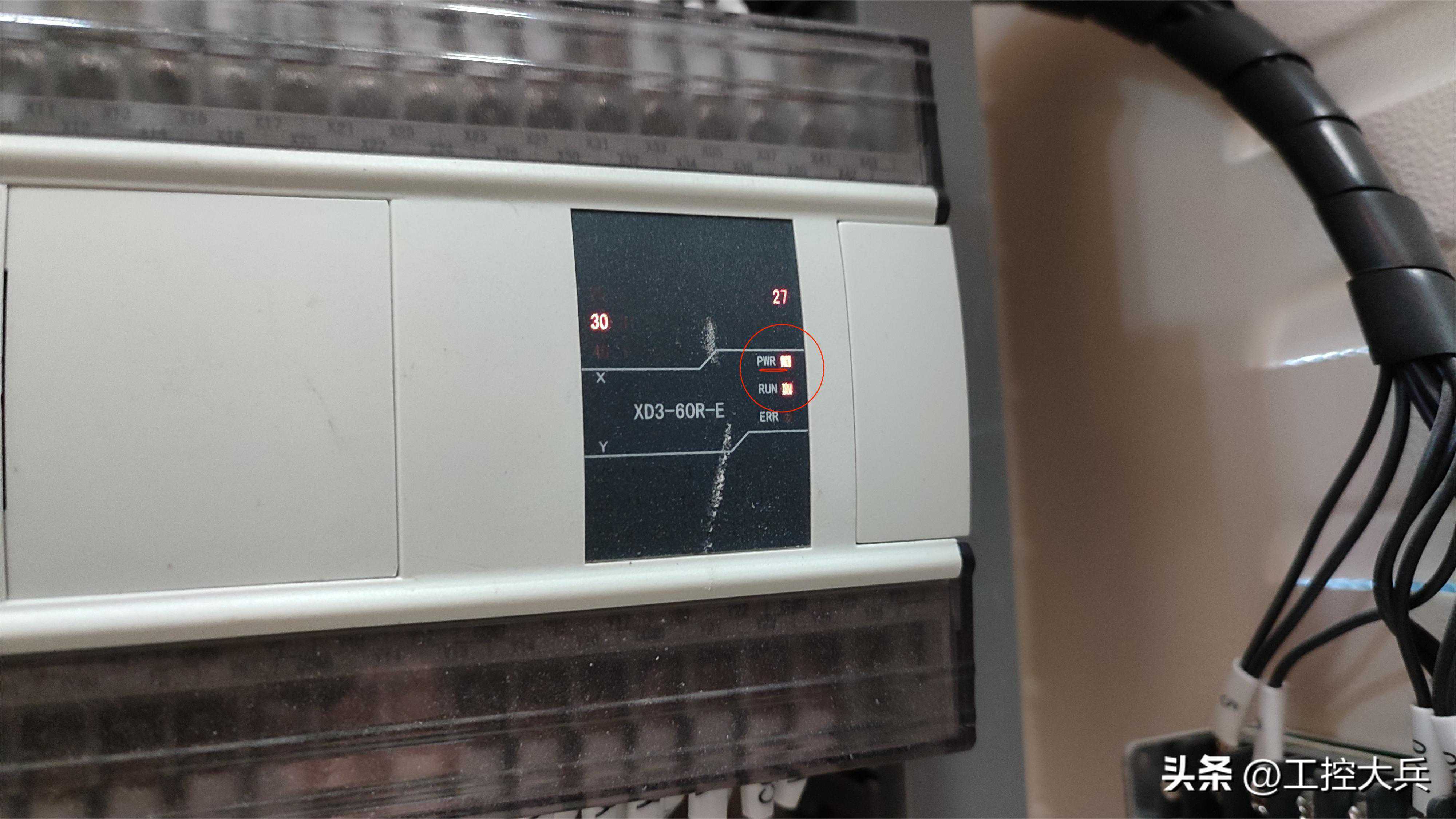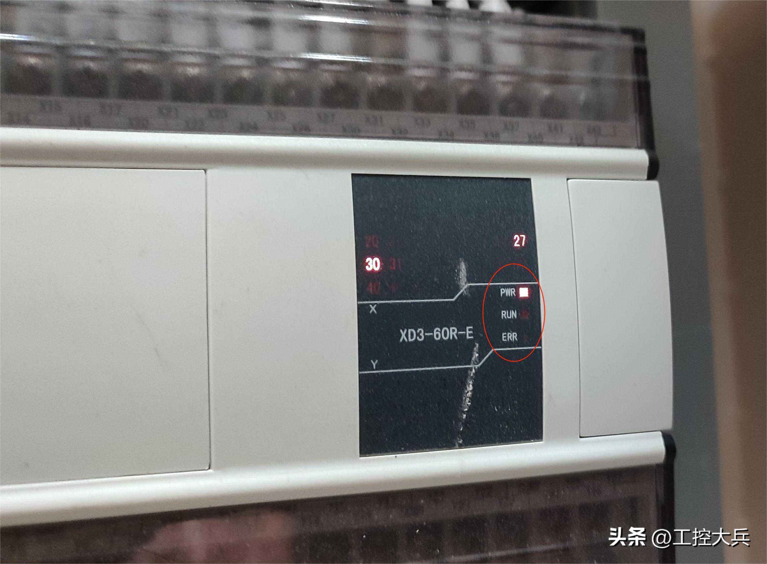 点了停止运行PLC后需要再次确认PLC是否停止工作,可以查看PLC右边的指示灯如下图,红圈处有三个指示灯,第一个PWR亮着的是工作电源指示灯,中间一个RUN就是运行指示灯,前面停止了PLC工作所以这个灯现在应是熄灭的,第三个灯是ERR故障指示灯。确认中间指示灯熄灭了就可以下载程序了