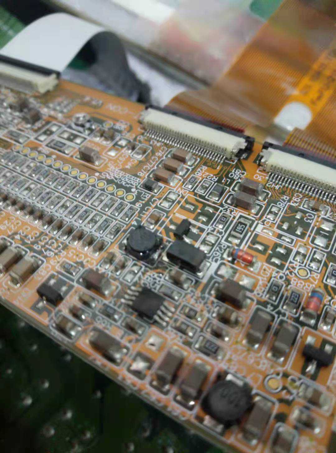 前两个触摸不准,是由于屏内外面尘土太多,清理后,校屏后就完事了。最后一个,上电白屏。经过排查怀疑是逻辑板的问题。三个屏型号一样,替换了下,确认是逻辑板问题。测量逻辑板vcom,vgl,vgh,vdd,电压全无。测量vcc,3.3v电压。你大爷的,这肯定是电压dc转dc电路出了问题。看来又要画图分析,头大了呀。突然看到有两个小电感。以前看过资料,说这种小电感,底部很容易氧化断路。抱着试试看心态,用万用表蜂鸣档测量第一个,嗡一声叫。哎,没坏!又测量第二个,万用表没声音。再测量,还是没声音。心中大喜,你丫丫个呸的,问题果然出在这里。拿起烙铁,一焊。送电后,图像显示正常了。