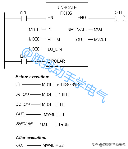 如果输入的信号状态为1(激活),则执行UNSCALE功能。在本例中,标定于0.0和100.0之间的实型值50.03978588,将转换为一个整型值,并写入OUT