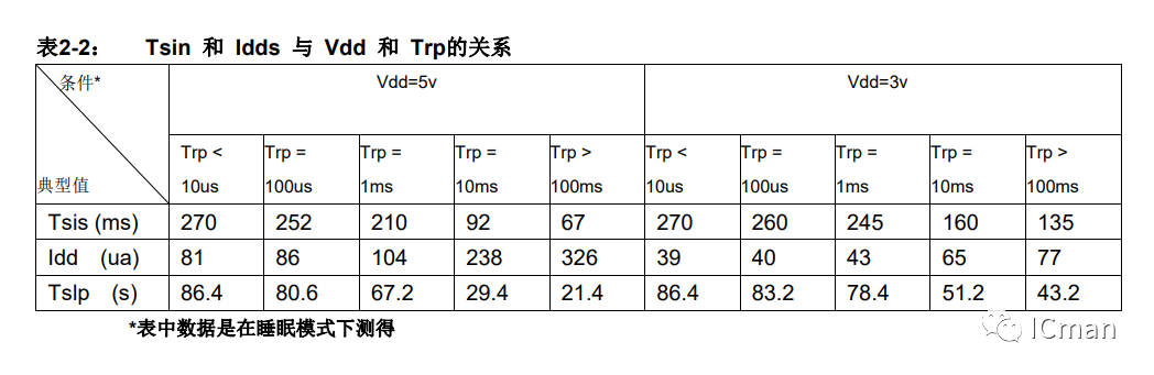 睡眠模式下,采样间隔Tsis和电流消耗Idds是与Vdd和Trp(电源上电时间,参考图2-2)有关的。详见下表2-2: