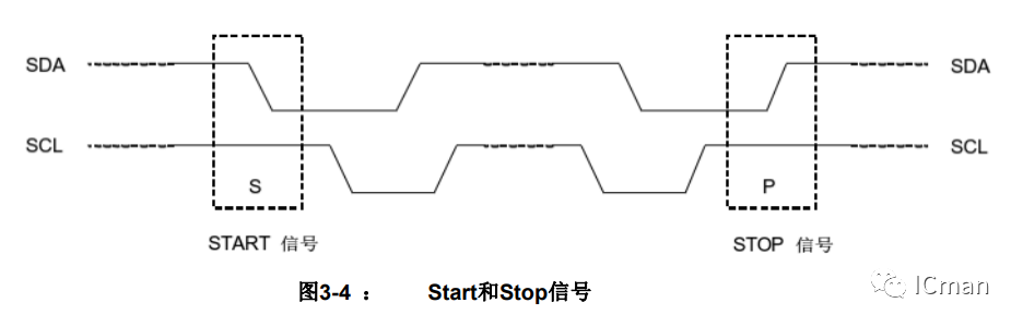当SCL是高电平时,SDA由高到底变化,表示开始传输数据。Stop信号(P)