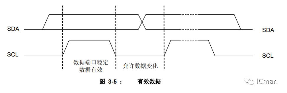 在SCL为高电平期间,SDA必须保持稳定的电平。SDA线上的高低电平变化只能在SCL为低电平期间。