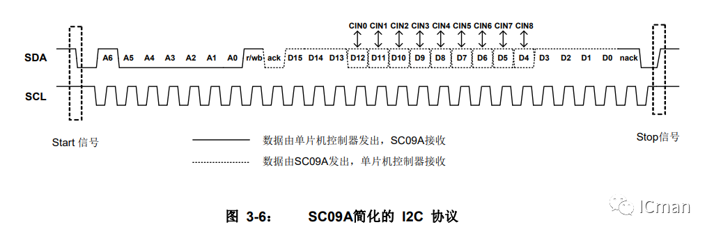 1)标准I2C器件有器件地址和寄存器地址。SC09A只有器件地址。
