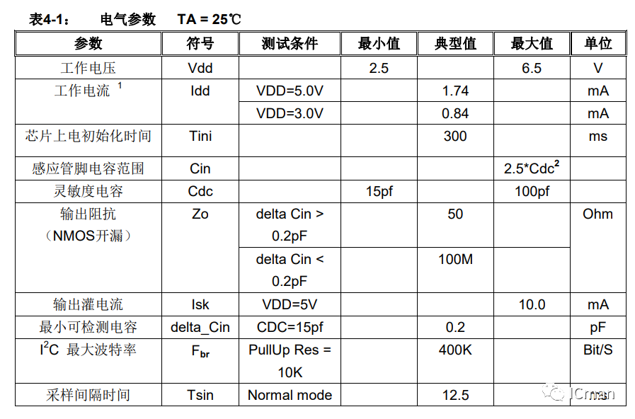 当检测到按键后,芯片会立即停止校正一段时间,这段时间大约15~50秒。停止校正时间一到,芯片会继续自校正,如果当前按键还是持续有效,按键信息会被当做环境的漂移立即被更新,也就是说检测按键有效的时间不会超过15~50秒。停止校正的时间与上电电压和电源上电时间有关。