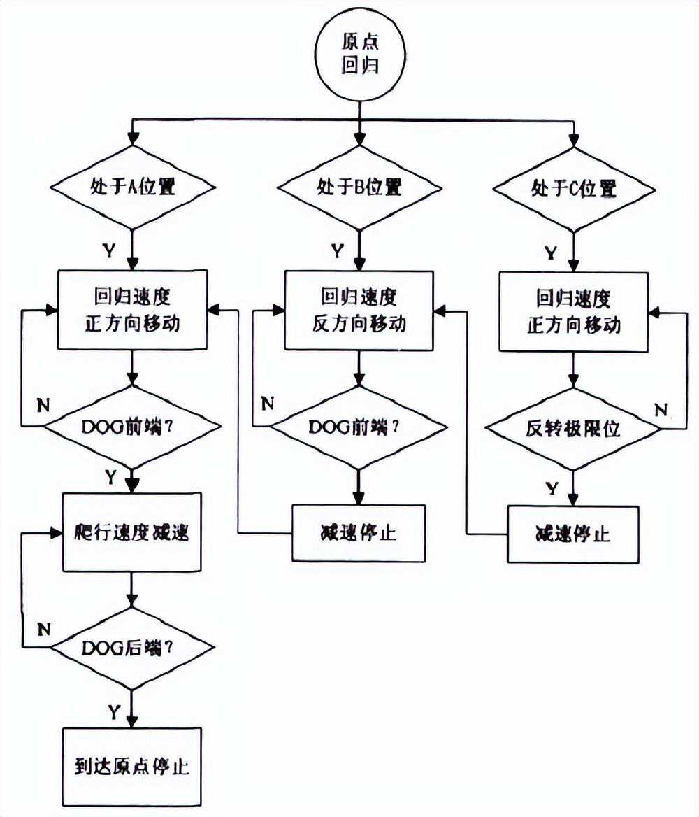 2原点回归程序本文不采取限位开关处作为原点,而是在预定原点位置(输箱带正上方y轴最高点处为原点,也称前等位)设置光电开关作为近点信号DOG,然后进行DOG搜索完成原点回归。由于原点回归位置不同,原点回归动作也相应不同。具体情况如图2,3所示。
