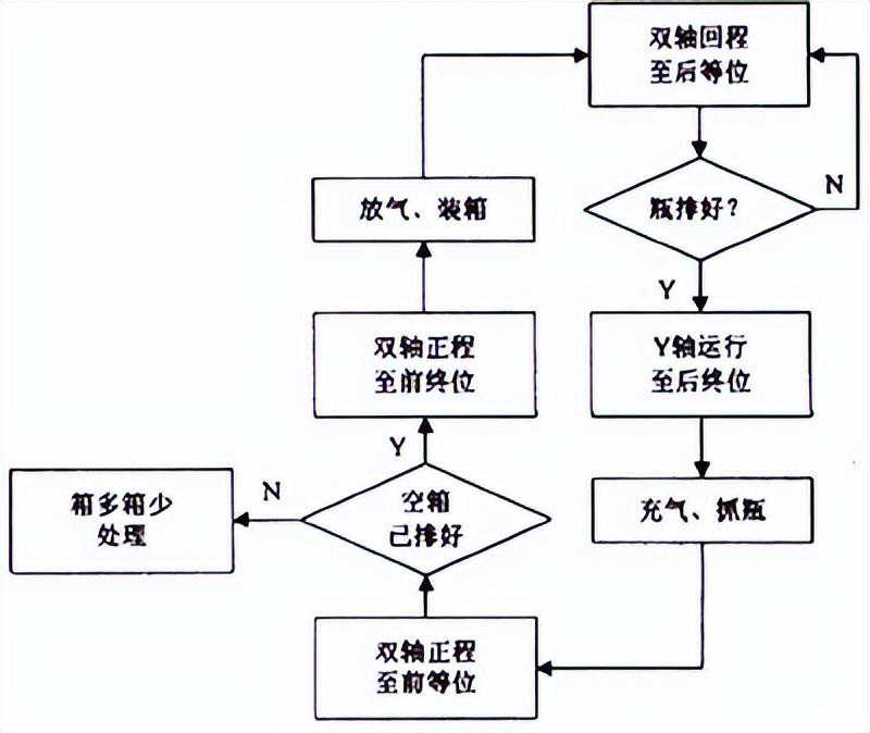 3自动运行程序自动过程配合光电检测系统完成从输瓶一抓瓶一装箱一输箱一回程整个周期的全自动运行,并包括各种异常出现的自动处理和箱少自动补箱。自动流程图如图4所示。