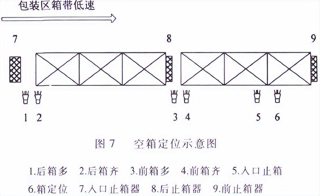 3.2空箱自动定位在输箱带上设置图6所示6个光电开关,配合三个止箱器完成对六个空箱进行分组及定位。其中光电开关5与入口止箱器7之问的距离为5.5个箱长,光电开关6与后止箱器的距离为2.5个箱长。