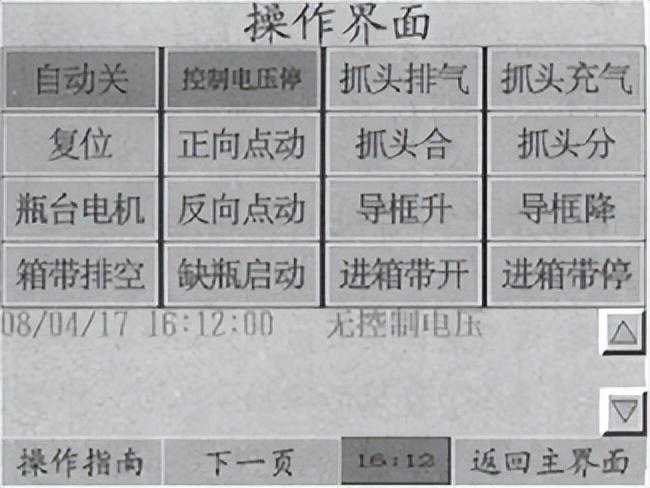 控制系统软件设计对装箱机的操作分为控制面板和人机界面的操作。对于控制电压、自动、手动、原点、复位等重要操作,设计在控制面板上进行按钮操作,对于手动操作中具体功能的操作在人机界面中执行。