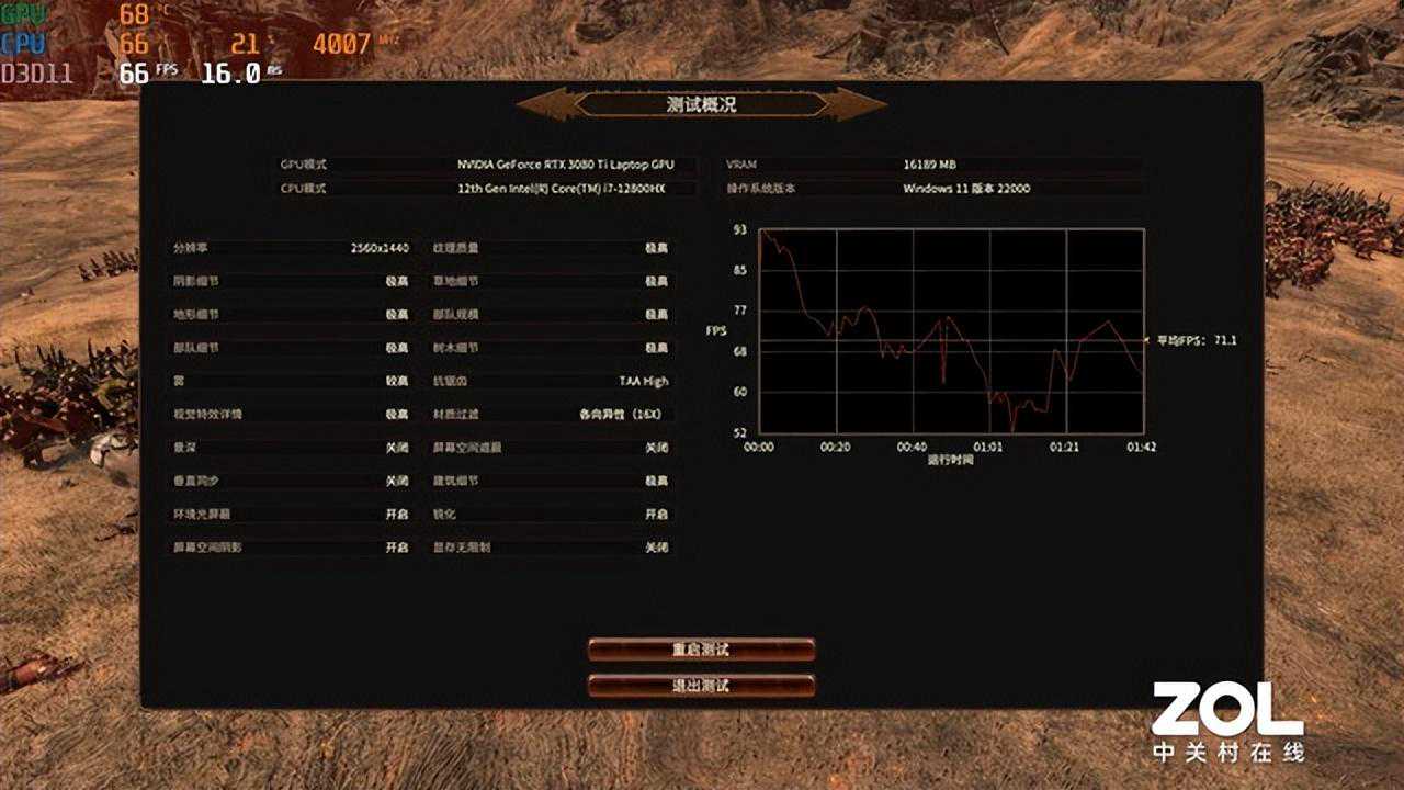在最高画质、2.5K分辨率下,冲锋坦克ProGP76HX运行这款游戏的平均帧数可以达到71.1fps,流畅度相当满意。