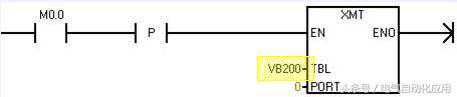 示例说明:PLC通过数据块写入数据。XMT指令中TBL缓冲区首地址VB200写入发送字符的个数,VB201和VB202分别写入发送字符。