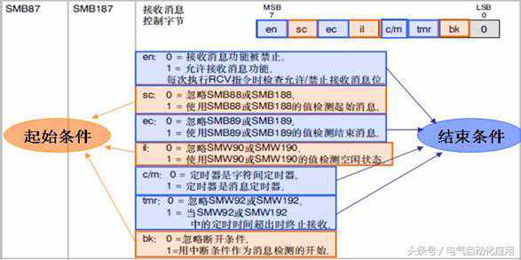 接收指令使用接收信息控制字节(SMB87或SMB187)中的位来定义信息起始和结束条件。必须为接收信息功能操作定义一个起始条件和一个结束条件(最大字符数)。如下图: