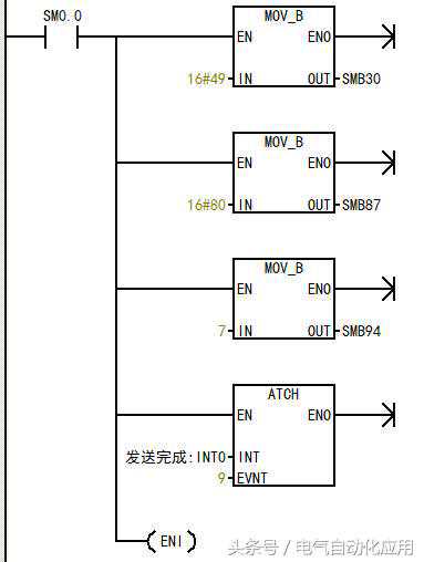 应用自由口通信首先要把通信口定义为自由口模式,同时设置相应的通信波特率和上述通信格式。用户程序通过特殊存储器SMB30(对端口0)、SMB130(对端口1)控制通信口的工作模式。
