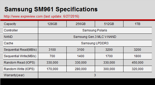三星SM961硬盘支持NVMe规范,采用了通道,它使用了全新的Polaris主控,搭配三星第三代48层堆叠V-NAND,容量从128GB到最高1TB,速度可以达到读取3200MB/s,写入1800MB/s,最大读写IOPS分别为450,000/320,000,此前的SM951最大读写速度只有2260/1600MB/s,SM961性能提升极大。
