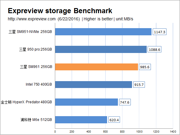 我认为三星SM961的性能还是相当的强的,这个从那些理论性能测试可以看得出来,然而现在的驱动限制了SSD的性能,不过即使受限它的表现其实还是强于Intel750的,略低于950Pro和SM951,平时跑跑CDM来YY下还是很爽的。