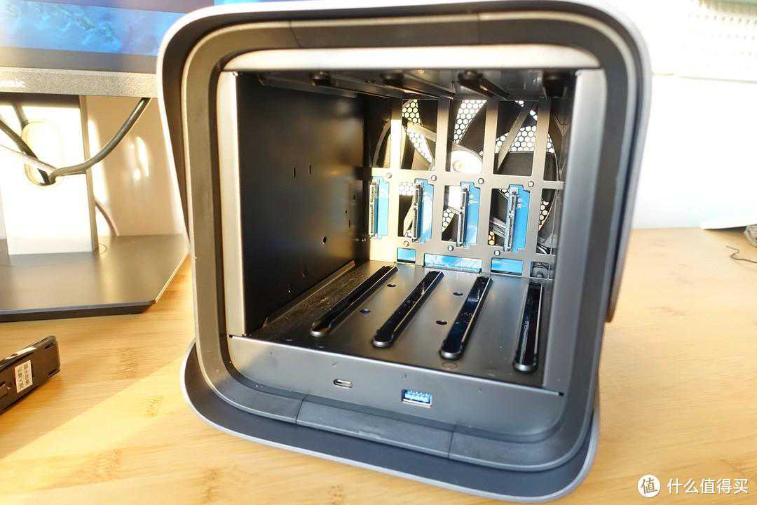 把NAS从背景布拿到桌面上,可以看到内部的做工很精细,基本看不到啥毛刺,硬盘背板看起来也比较靠谱。硬盘支架抽拉时挺顺滑,比我手头的黑群晖和威联通TS-262C要流畅的多。