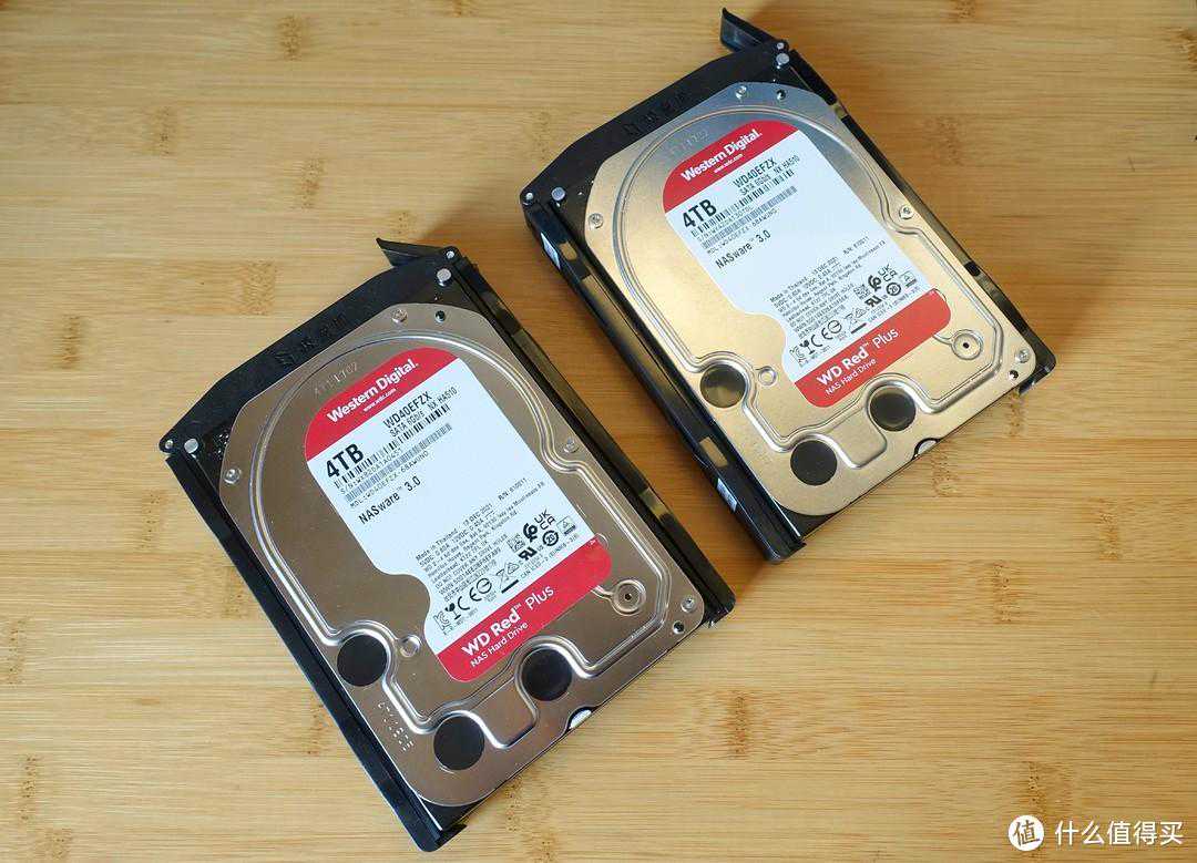 这里我用了两块西部数据的4T红盘Plus,非叠瓦盘。NAS专用盘由于转速低,发热和噪音表现都远强于企业级硬盘,缺点就是价格着实高了点。