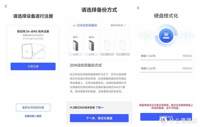 相较于群晖、威联通等传统NAS,极空间新Z4为了保证数据的安全性,只支持ZDR动态备份以及RAID1、RAID5三种硬盘模式,并且会对插入的硬盘进行格式化操作,大家记得提前备份好旧硬盘里的数据。