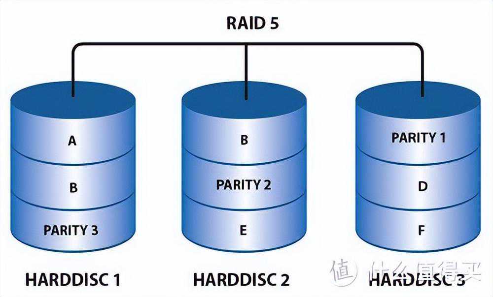 RAID5模式需要至少3块硬盘来组建磁盘阵列。在写入数据时,将数据并发写入到阵列中所有磁盘中,并且将数据校验信息也写入所有磁盘中。一旦某一块磁盘发生损坏,可以用其余磁盘中的数据和相应的校验信息恢复损坏的数据。