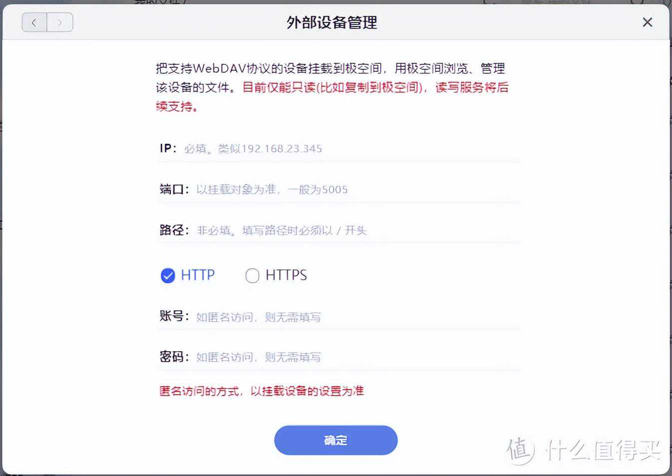 常见的USB、Type-C等方式挂载移动硬盘且不多说,这里可以看到的是,目前已经支持以SMB和WebDav协议将其他厂商NAS中的文件夹挂载过来。