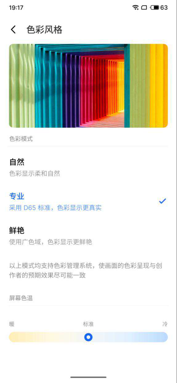 此外,魅族21自带的屏幕色彩风格包含D65标准的专业模式,视觉上会感觉色温偏暖,但对于大部分人看上去更加舒适,并且支持1920Hz高频PWM调光,有SGS低蓝光护眼认证,对于眼睛敏感的人群来说这块屏幕算是非常不错了。
