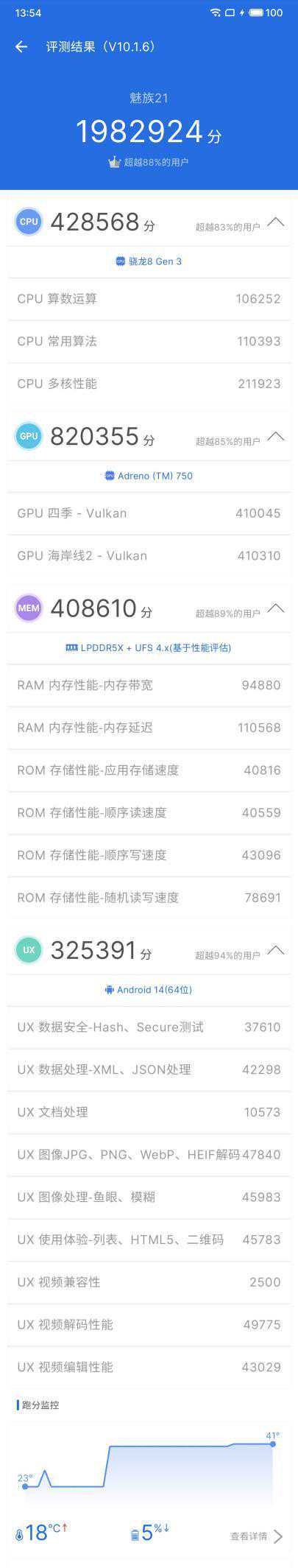 在起始温度23°情况下,小编手头这台12GB+512GB的魅族21在安兔兔V10版本中,得到了1982924分的成绩,也是目前最顶尖的性能表现之一。