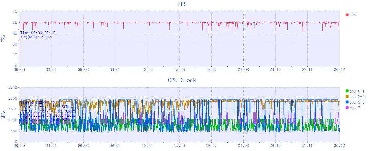 CPU频率比较有趣,前16分钟,魅族21的大核和性能核频率直接锁死,维持在非常高的水平,不过16分钟之后又恢复正常。