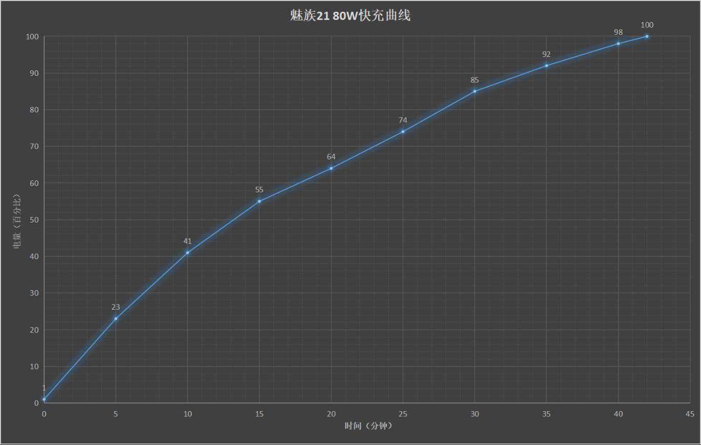 在我们的实际快充测试中,魅族21从1%电量开始,5分钟充至23%,10分钟充至41%,15分钟充至55%,20分充至64%,25分钟充至74%,30分充至85%,35分充至92%,40分钟充至98%,完全冲满共用时42分钟。