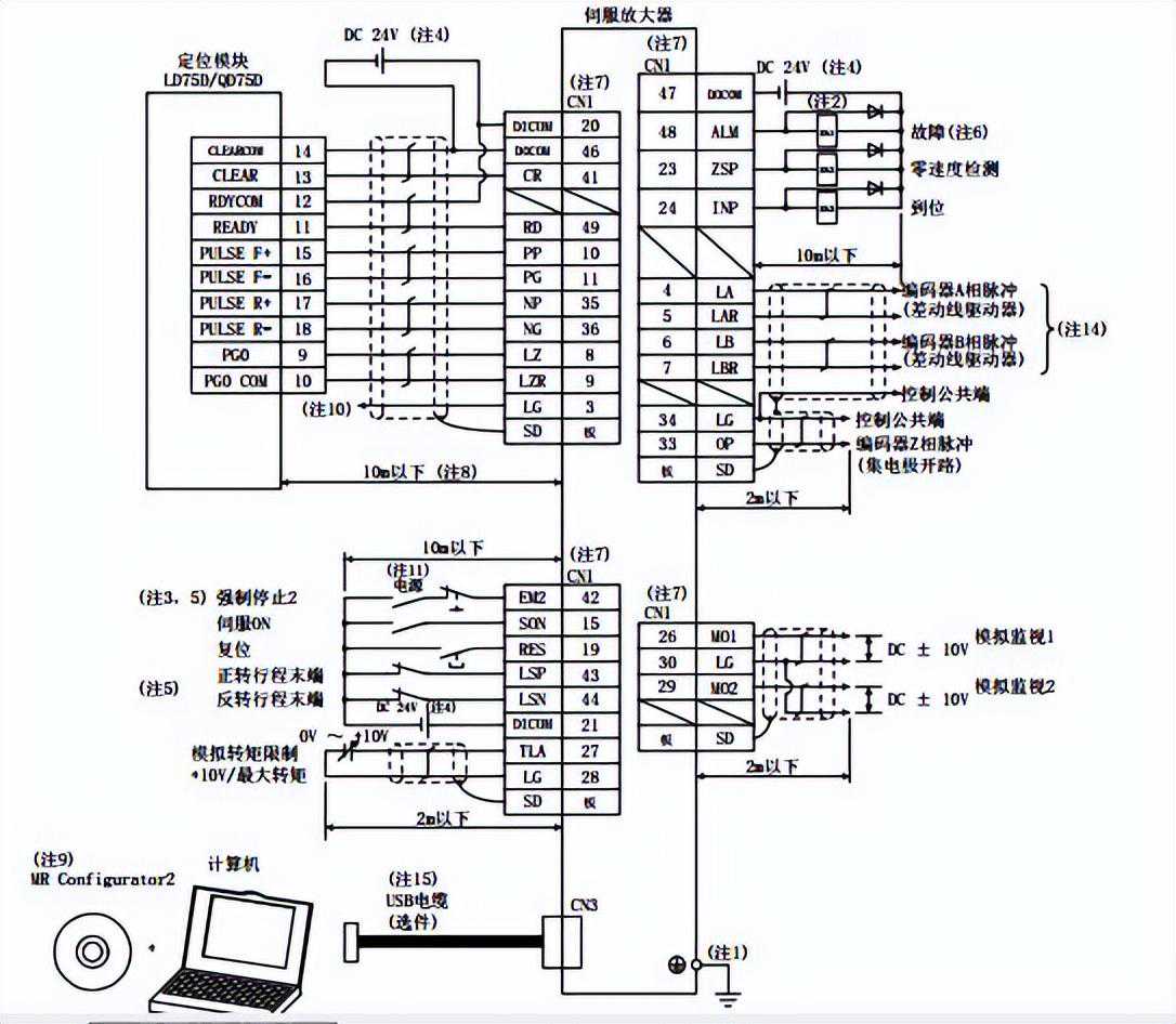 3、将三菱伺服定位完成信号INP(24号引脚)接PLCX端,意思表示三菱伺服定位完成后给PLC一个信号!