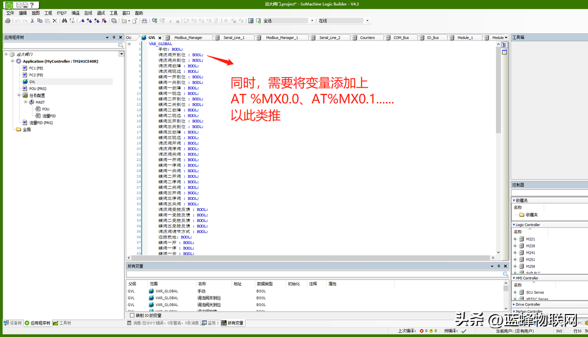 【寄存器类型】:在施耐德M340PLC中,离散量的输入输出使用的是%M地址,模拟量使用的是%MW地址(Modbus寄存器对应关系可以参考下面案例的采集变量对照表)。