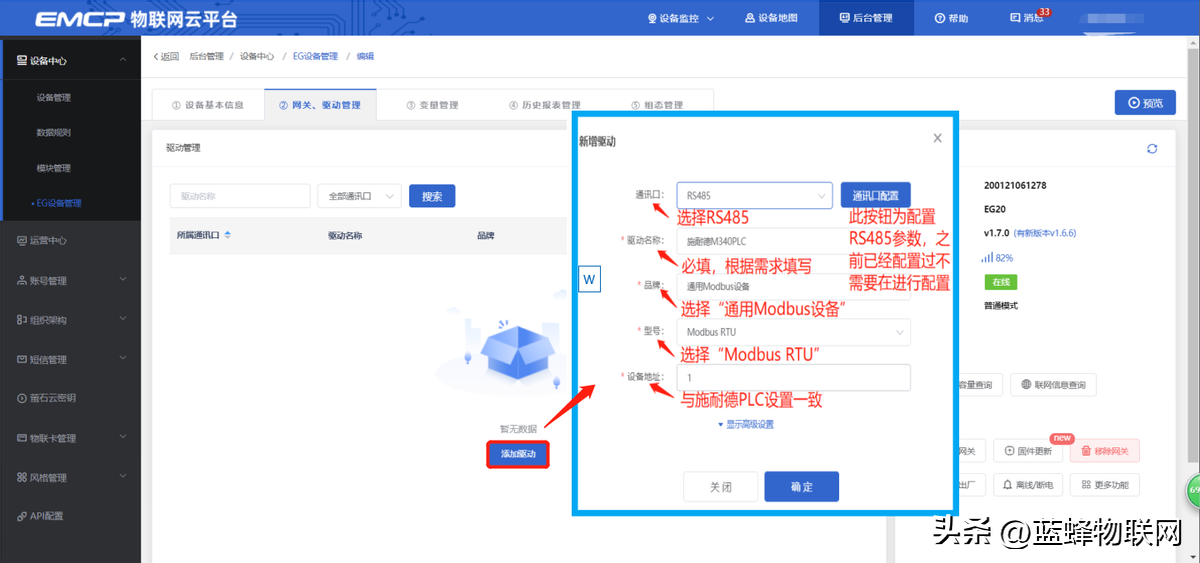 远程配置最主要两个地方需要配置,一是配置网关485通讯参数,二是在平台上创建施耐德PLCmodbus-RTU的设备驱动,下面分步骤对此功能进行讲解。注:网关只有在线后才可以进行远程配置。