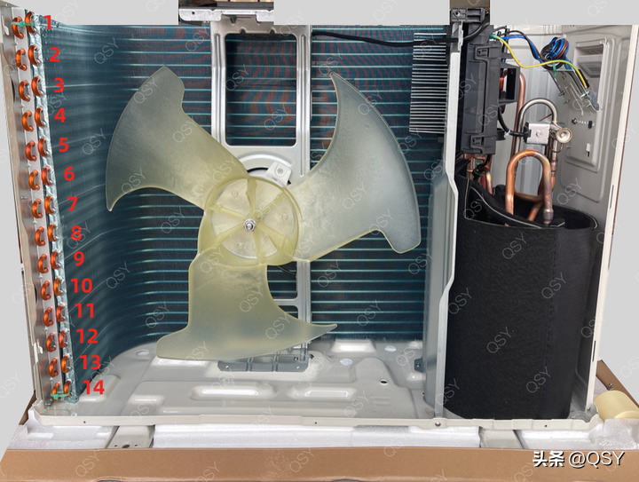 ▲拆开外机顶盖,能看到冷凝器是双排铜管;两台空调都是竖置电控板布局,好处能够节省空间。