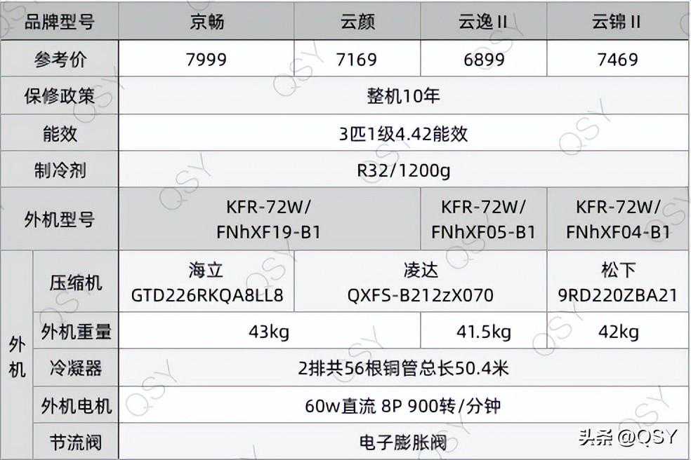 经过拆机确认,京畅使用海立GTD226RKQA8LL8双转子压缩机,排量为22.6cc,带电子膨胀阀。冷凝器是双排56根7mm铜管总长约50.2米,60w通达直流电机,三花不锈钢四通阀。